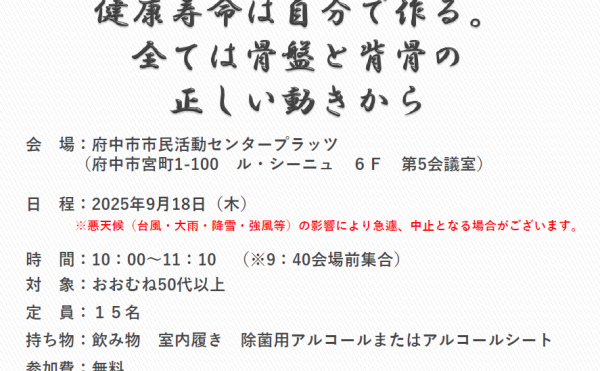 2025年9月8日宮入 体操教室&防災減災ミニセミナーのご案内弊社主催のイベント情報です。 以下の日程で、体操教室&防災減災ミニセミナーを開催いたします。 ◆日時 2025年9月18日 10:00~11:10(9:40開場) ◆場所 府中市市民活動センタープラッツ (府中市 […]